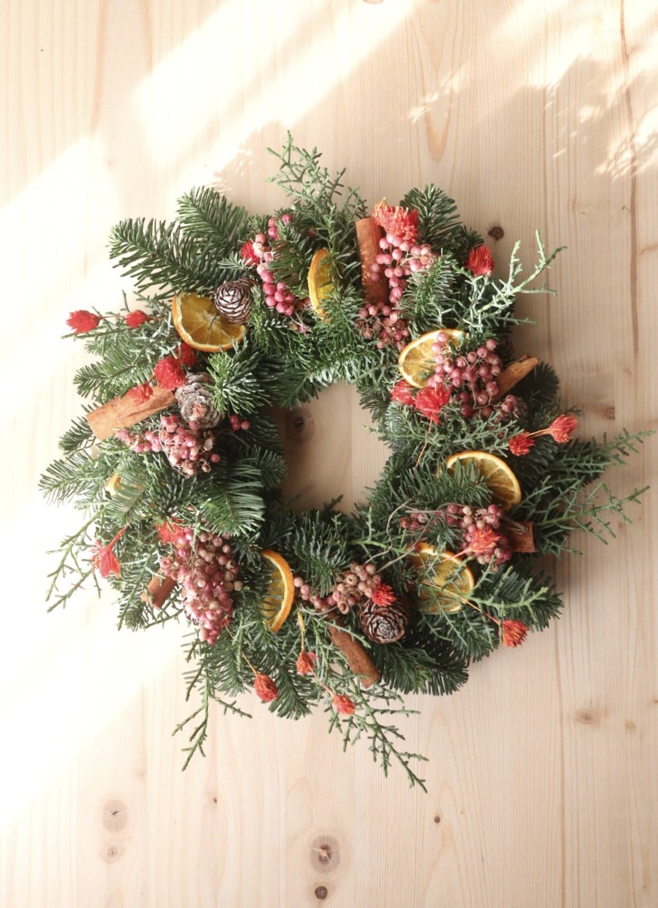 Si tratta di una ghirlanda-centrotavola costituita da: pino, cipresso, arancia essiccata, cannella, pigne e pepe rosa.